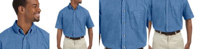 100% cotton denim; Inside, flat-felled seams; Khaki double-needle topstitching; Left-chest pocket and signature twill tape at neck; Fully constructed front placket with button-down collar; Signature horn-style buttons with Harriton logo; Buttons use contrast thread;