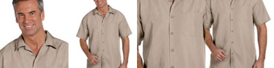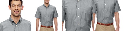 55% cotton, 45% polyester with stain-release; Extra stitching at seams and buttons; Flat-felled seam finishing; Wrinkle-Resistant; Short-sleeves; Full back yoke and back pleat; Button-down collar and left-chest pocket;