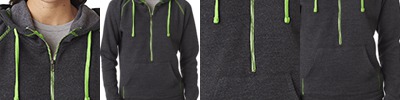7.25 oz. 60% cotton, 40% polyester melange fleece; Scuba neckline; Contrast fabric on hood, shoulders, and arms; Front pouch pocket; Rib waist & cuffs;