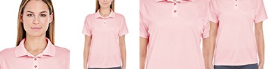 4.8 oz., 100% micro-textured polyester knit; Anti-bacterial; Moisture-wicking; Feminine fit; Flat-knit collar; 3-button placket; Hemmed sleeves; Matching shoulder panels; Side vents; Tagless;